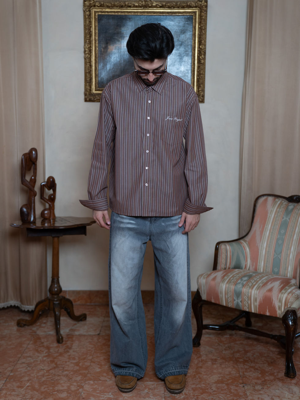 - BROWN PINSTRIPE COTTON SHIRT WITH EMBROIDERED SCRIPT LOGO